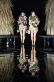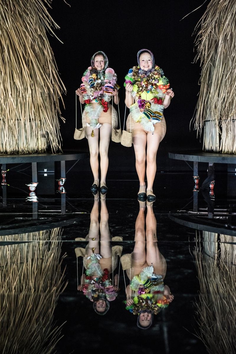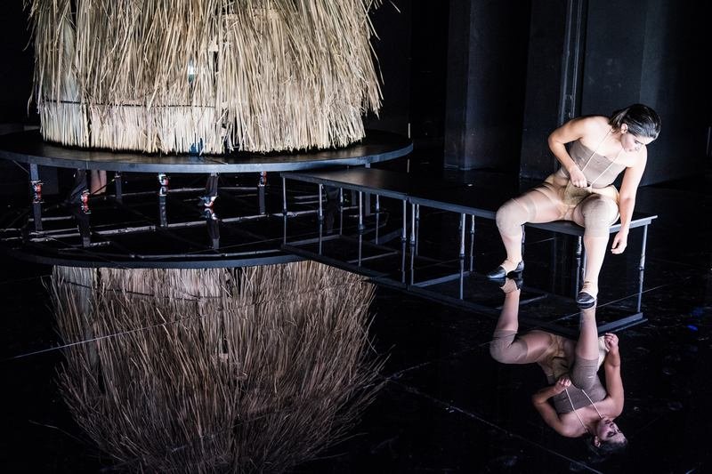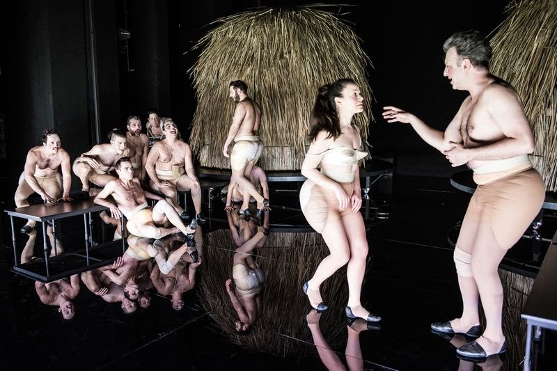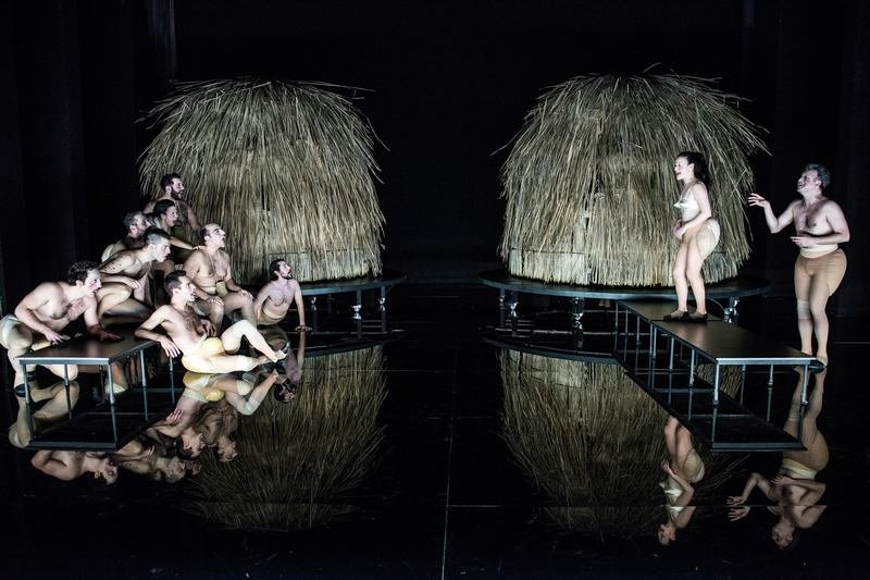 Η παράσταση στήνει ένα πρωτόγονο και, ταυτόχρονα, μελλοντολογικό σκηνικό περιβάλλον, ένα άγριο μεταβατικό μέρος. Δύο τροπικές καλύβες, δύο μεγάλα γλυπτά από φυσικά υλικά που ορθώνονται πάνω σ' ένα γυαλιστερό μαύρο πάτωμα, μια αλλόκοτη, μαύρη γη που καθρεφτίζει κι εκθέτει. Οι ήρωες του έργου περιφέρονται διεφθαρμένοι πλέον κι ασύδοτοι, πιάνουν καβγάδες και μιλούν ακατάπαυστα, προσπαθώντας να γεμίσουν με λόγια το κενό. Προσπαθώντας να υπάρξουν μέσω της εικόνας που δημιουργούν στους άλλους.