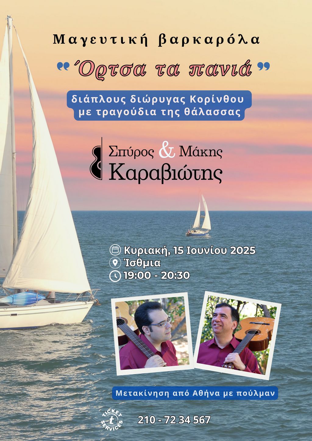 Οι σύγχρονοι τροβαδούροι της αγάπης, αδελφοί Σπύρος & Μάκης Καραβιώτης, σας προσκαλούν την Κυριακή 15 Ιουνίου & ώρα 19:00 στη μαγευτική βαρκαρόλα τους, που θα πραγματοποιηθεί στην θαλάσσια περιοχή των Ισθμίων και του όρμου Λουτρακίου δια μέσου της διώρυγας της Κορίνθου.