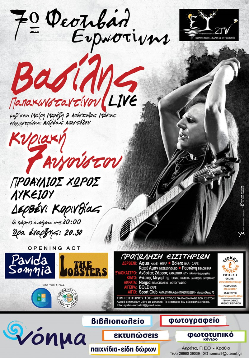 Την Κυριακή 7 Αυγούστου ο Βασίλης Παπακωνσταντίνου θα μας χαρίσει μια μοναδική συναυλία στο Δερβένι Κορινθίας (Προαύλιος Χώρος Λυκείου). Θα βουτήξει για χάρη μας στην ατέλειωτη δισκογραφία του και θα διαλέξει να μας τραγουδήσει τα «διαμάντια», τα τραγούδια «σταθμούς» και όλα τα αγαπημένα του/μας.