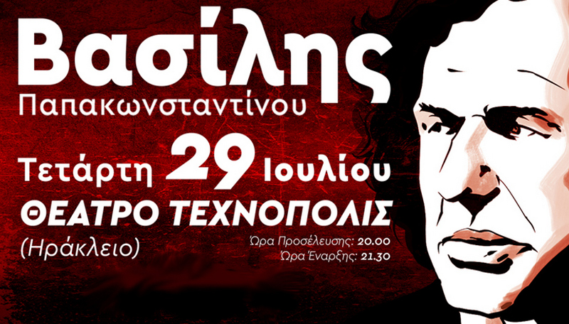 Την Τετάρτη 29 Ιουλίου ο Βασίλης Παπακωνσταντίνου πιστός στα καλοκαιρινά του ραντεβού έρχεται στο Θέατρο Τεχνόπολις στο Ηράκλειο, για μια μεγάλη συναυλία με τραγούδια - σταθμούς και με ένα κοινό που τον κουβαλά μέσα του - από γενιά σε γενιά.