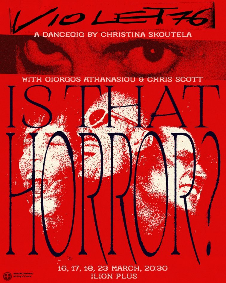 Το violet76 - is that horror? είναι ένα dancegig που ακροβατεί μεταξύ χορογραφίας, συναυλίας και κινηματογραφικού εφιάλτη. Μια συλλογική εμπειρία μοιράσματος του live stage που εμπνέεται από την εκρηκτική ενέργεια της punk, την αγωνία των ταινιών τρόμου, και την ανάγκη για ελεύθερη έκφραση. Οι τρεις περφόρμερ, o Chris Scott, o Γιώργος Αθανασίου και η Χριστίνα Σκουτέλα συναντιούνται, αφήνουν τα σώματα τους σε μία άγρια περιπλάνηση μουσικής και κινητικής έντασης κι αναρωτιούνται: είναι τρόμος;