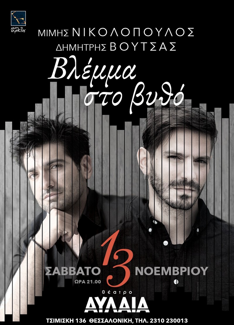 Έτσι το Σάββατο 13 Νοεμβρίου, στο Θέατρο Αυλαία στις 21:00, ο Δημήτρης Βουτσάς και ο Μίμης Νικολόπουλος με πενταμελή ορχήστρα γιορτάζουν την πρεμιέρα των τραγουδιών με τίτλο «Βλέμμα στο βυθό», σε μια μουσική παράσταση η οποία περιλαμβάνει επίσης μια γεύση από τις ορχηστρικές δουλειές του συνθέτη αλλά και επιλεγμένα εμβληματικά τραγούδια.