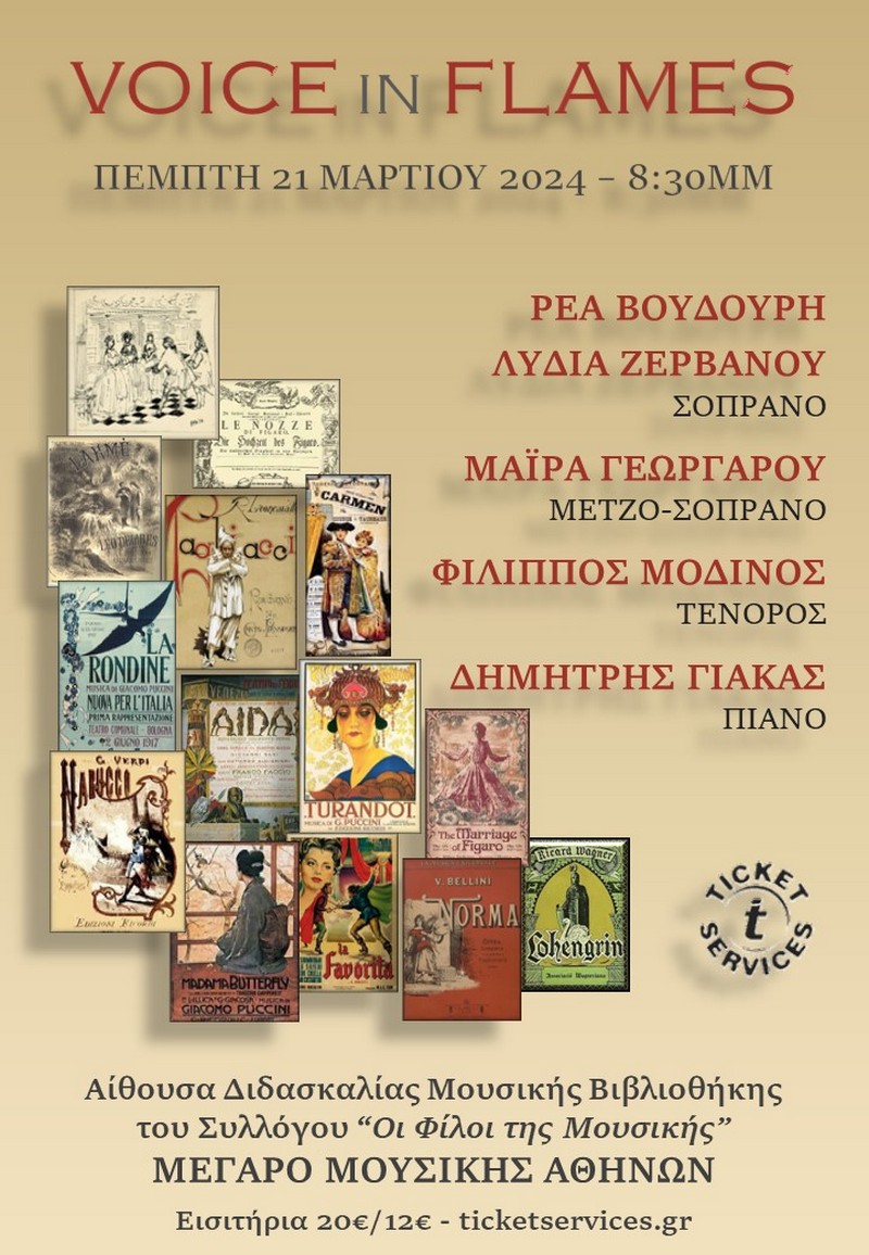 Οι ξεχωριστοί λυρικοί καλλιτέχνες Ρέα Βουδούρη, Λυδία Ζερβάνου, Μάιρα Γεωργάρου και Φίλιππος Μοδινός υπό τη συνοδεία του καταξιωμένου πιανίστα Δημήτρη Γιάκα, θα συμπράξουν σε ένα αστραφτερό πρόγραμμα όπου οι φωνές «παίρνουν φωτιά» μέσα από άριες, ντουέτα και σύνολα του ευρύτατου ρεπερτορίου της όπερας.