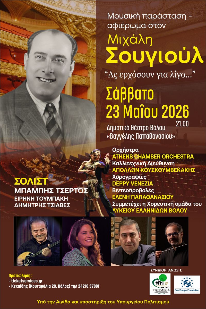 Μετά τις Sold Out συναυλίες στο Μέγαρο Μουσικής Αθηνών, μια μαγική βραδιά, γεμάτη μουσική , τραγούδι, χορό, όμορφες εικόνες, νοσταλγία , έντονα συναισθήματα , ποιότητα και αισθητική, θα ζήσει το φιλόμουσο κοινό του Βόλου το Σάββατο 23 Μαΐου 2026 και ώρα 21.00, στο Δημοτικό Θέατρο Βόλου «Βαγγέλης Παπαθανασίου» , αφιερωμένη στον σπουδαίο Έλληνα συνθέτη, που αγαπήθηκε από όλους τους Έλληνες, τον Μιχάλη Σουγιούλ , με τίτλο: "Ας ερχόσουν για ...λίγο!".
