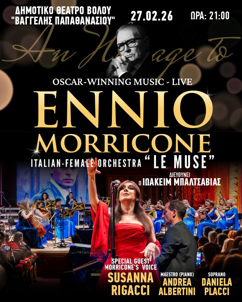 Οι πασίγνωστες μελωδίες του μεγάλου Ιταλού συνθέτη και Μαέστρου Ennio Morricone σε ταινίες όπως «Σινεμά ο Παράδεισος», «Η Αποστολή», «Για μια χούφτα δολάρια», «Ο καλός, ο κακός και ο άσχημος», «Malena», «Κάποτε στη Δύση», «Sacco and Vanzetti», «Κάποτε στην Αμερική» και πολλών ακόμα, πρωταγωνιστούν στην συναυλία με την Γυναίκεια Ορχήστρα από την Ιταλία "LE MUSE", με την μοναδική σολίστ, diva του Μοrricone, Susanna Rigacci που τον ακολούθησε στις συναυλίες του επί 20 χρόνια.