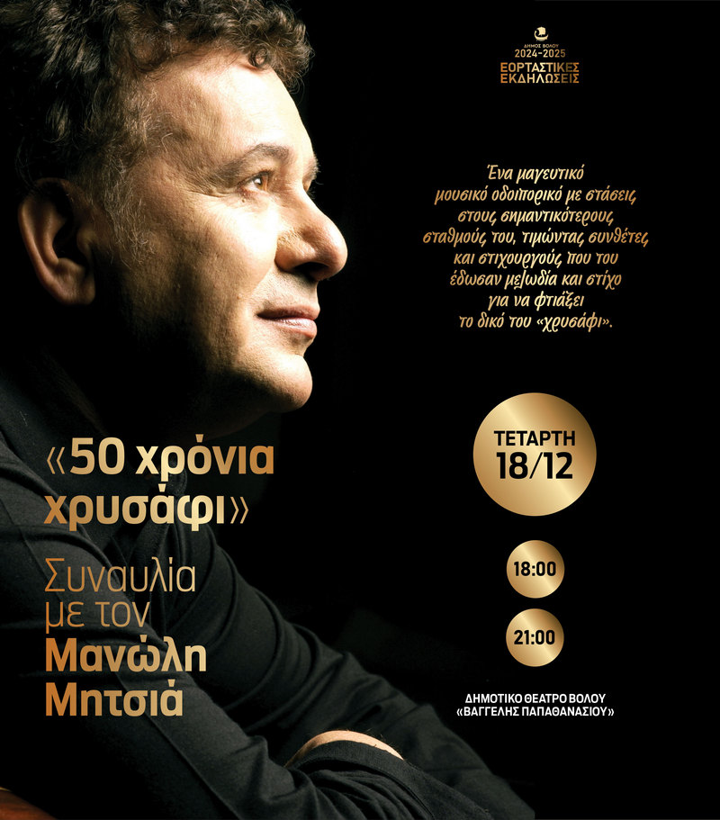 Την Τετάρτη 18 Δεκεμβρίου στις 18:00 & στις 21:00 στο Δημοτικό Θέατρο Βόλου «Βαγγέλης Παπαθανασίου» ο Μανώλης Μητσιάς παρουσιάζει με την ορχήστρα του, την ιστορία του ελληνικού τραγουδιού των τελευταίων 50 χρόνων.