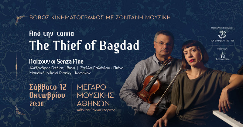 Το Σάββατο 12 Οκτωβρίου το Μέγαρο Μουσικής ΑΘηνών θα υποδεχτεί μία ξεχωριστή μουσική παράσταση. Οι θεατές θα έχουν την ευκαιρία να παρακολουθήσουν την υπέροχη, βωβή ταινία του 1924 (μόλις 100 ετών...), τον "Κλέφτη της Βαγδάτης", με τους Senza Fine, Στέλλα Γιαλόγλου στο πιάνο και Αλέξανδρο Γκέλια στο βιολί, να ερμηνεύουν τη μουσική της ταινίας, ζωντανά επί σκηνής.