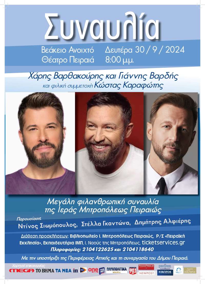 Ο Χάρης Βαρθακούρης και ο Γιάννης Βαρδής, με τη φιλική συμμετοχή του Κώστα Καραφώτη θα τραγουδήσουν στην Φιλανθρωπική Συναυλία που διοργανώνει, για μία ακόμη φορά, η Ι.Μητρόπολη Πειραιώς με την υποστήριξη της Περιφέρειας Αττικής και την συνεργασία του Δήμου Πειραιά, τη Δευτέρα 30 Σεπτεμβρίου 2024, στις 20:00, στο Βεάκειο Θέατρο Πειραιά.