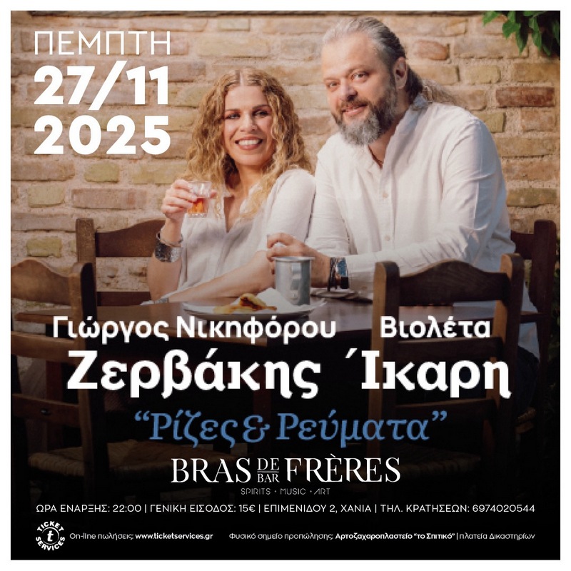 Δύο από τις πιο ξεχωριστές φωνές της σύγχρονης ελληνικής μουσικής σκηνής, ο Γιώργος Νικηφόρου Ζερβάκης και η Βιολέτα Ίκαρη, συναντιούνται φέτος σε μια ιδιαίτερη μουσική σύμπραξη με τίτλο «Ρίζες και Ρεύματα».