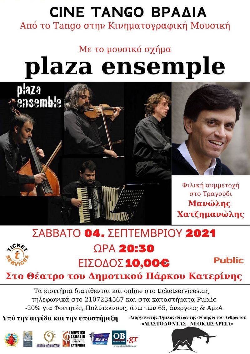 Ο Όμιλος Φίλων της Φύσης και του Ανθρώπου «Μαστόδοντας - Νεοκαισάρεια» διοργανώνει την συναυλία "CINE - TANGO", από το Tango στην Κινηματογραφική Μουσική, με το «Plaza Ensemble», το οποίο εμφανίζεται για πρώτη φορά στην πόλη της Κατερίνης, και την φιλική συμμετοχή του τραγουδιστή Μανώλη Χατζημανώλη.